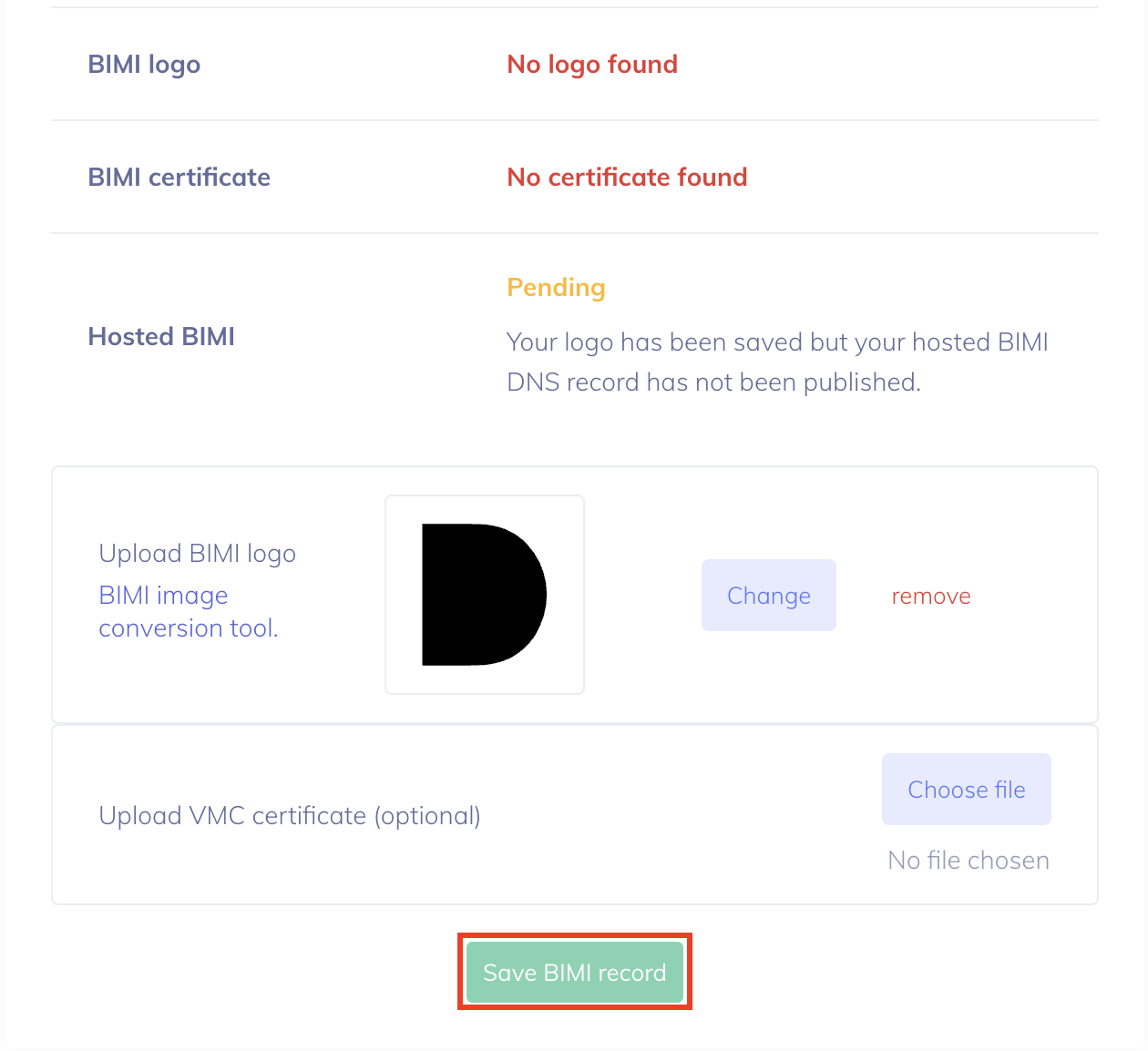 ロゴ(およびオプションでVMC証明書)をアップロードしたら、"BIMIレコードを保存 "をクリックします。