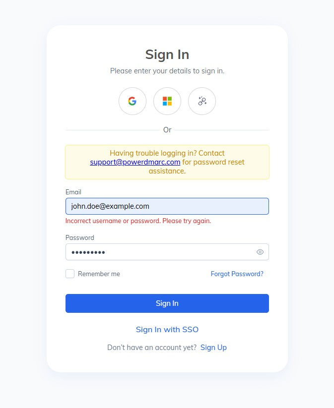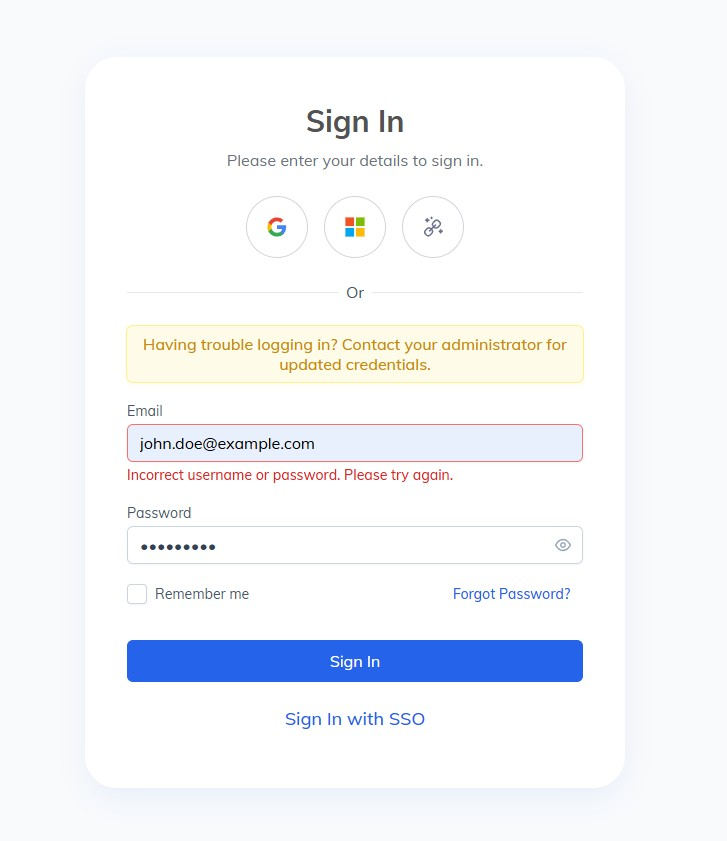 ログインページでは、一般的なエラーを表示する代わりに、失敗した試行を特定し、アカウントの設定に基づいて最も関連性の高い次の手順を強調表示します。これには、パスワードのリセット、シングルサインオン(SSO)プロバイダーの使用、管理者またはサポートへの連絡などのガイダンスが含まれる場合があります。